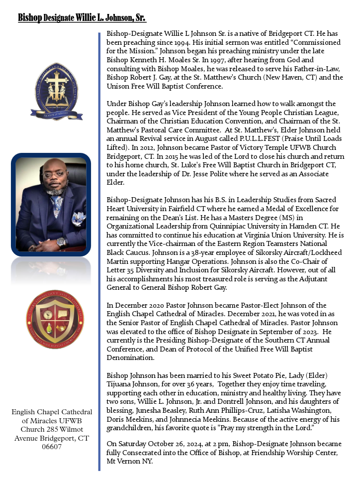 On Saturday October 26, 2024, at 2 pm, Bishop Willie L. Johnson was fully Consecrated into the Office of Bishop, at Friendship Worship Center Mt Vernon NY.